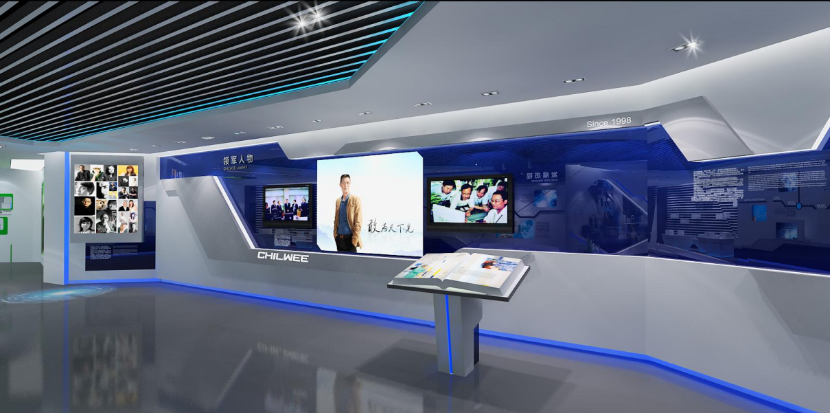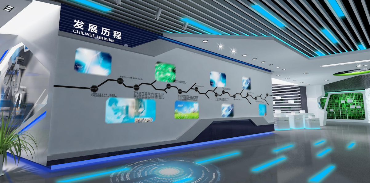 作为展区最核心的板块,采用光带营造动态氛围,寓意企业的高速发展。通过多台摄像机在墙面与地面投射连贯的视频动画,结合静态的艺术图文与可触控的互动墙面,全面、生动地呈现企业的发展历程。